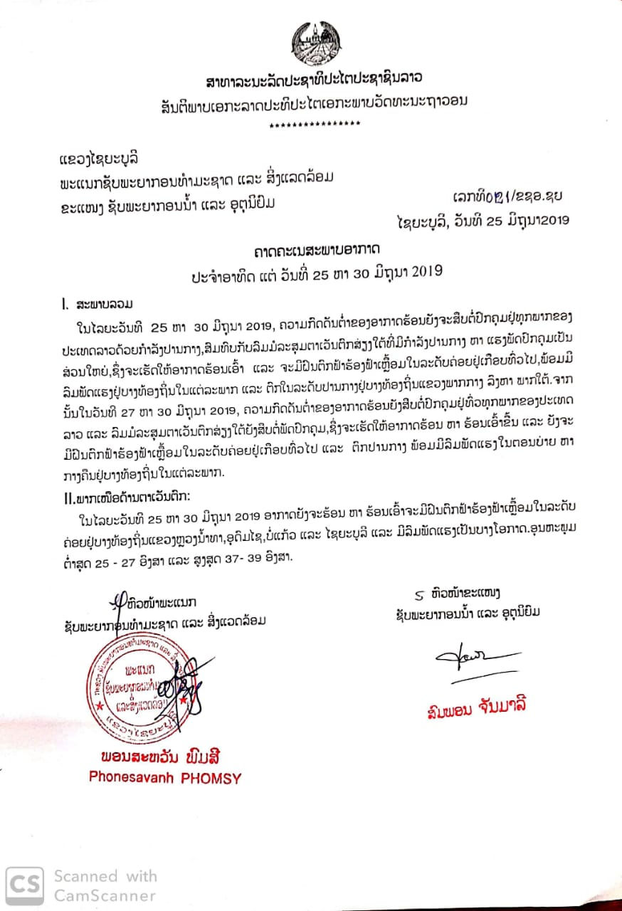 ຄາດຄະເນສະພາບອາກາດ ແຕ່ວັນທີ່ 25-30 ມິຖຸນາ 2019